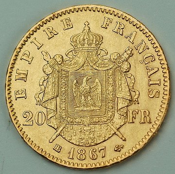 Frankrig, Napoleon III, 20 francs GULD 1867BB - KM 801.2