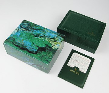 Rolex original grøn salgsæske inkl. marmoreret yderkassen, indeholdende kalender 2005/2006 samt certifikatholder.