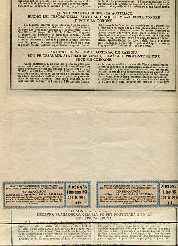 Østrig, 2 stk. krigsobligationer 5.000 og 10.000 Kronen 1916, henholdsvis Nr. 026,855 og 013,741, begge med 2 resterende kuponer 1921/1922.