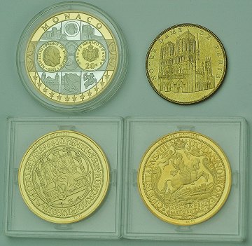 Lot blandede medailler m.v., bestående af: 2 stk. medailler af angiveligt sterlingsølv forgyldt m. 24 kt. guld, præget som kopier af berømte mønter, medaille af delvist forgyldt metal "Monaco", tourist-medaille fra Notre-Dame i Paris, amerikansk half dollar m. erindringskuvert medfulgt af etui samt ægthedscertifikat, privat møntsæt 1970.