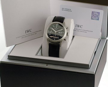 Herrearmbåndsur fra International Watch Company (IWC), model Fliegeruhr, ref.nr.: IW3706, i kasse af stål, sort skive m. arabertal, chronograffunktioner, safirglas, monteret m. original sort læderrem m. foldespænde, automatisk urværk. Ø. 39 mm.
