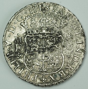 Interessant sølvmønt, præget i Mexico City under Philip V. Mønten er sammen med et stort parti andre sølvmønter fundet i et spansk skibsvrag, hvilket overfladen i noget grad bærer præg af.