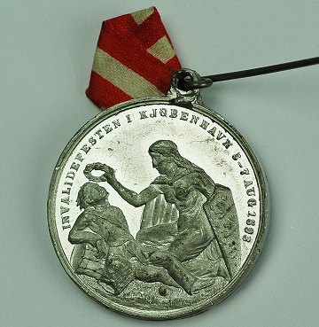 Medaille af metal m. rødt og hvidt bånd, præget i anledning af invalidefesten i København 1895. På fs. ses busteportræt af Frederik VII og Christian IX. Ø. 30 mm.