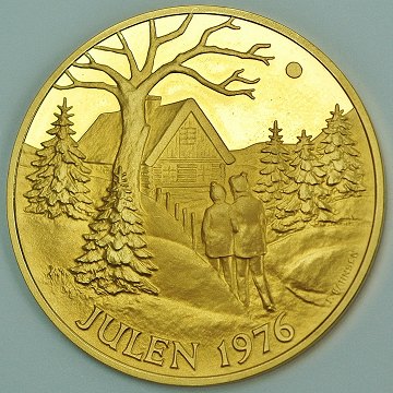 Svensk julemedaille af 18 kt. guld, præget m. profilportræt af Carl Gustaf XVI og dronning Silvia på fs. samt sne landskab på bs. Ø. 40 mm.