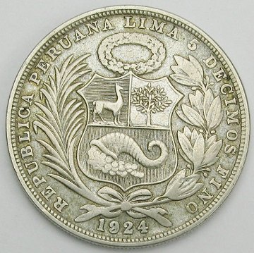 Peru, sol SØLV 1924 - KM 218.1, finsølvindhold 12,5 gr.