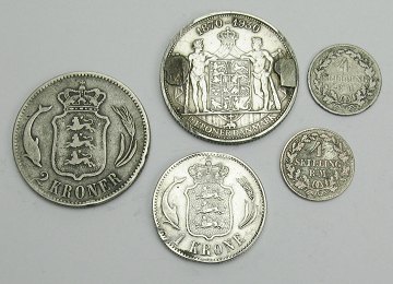 Samling bestående af 2x 4 skilling 1854 og 1856, 1 kr 1915 og 2x 2 kr 1876 og 1930. Samlet finsølvindhold 30,8 gr.