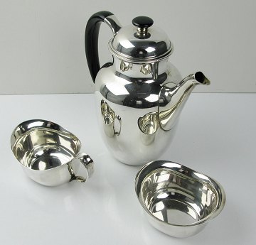 Dansk moccasæt af sølvplet, bestående af balusterformet kande med glat korpus, hank og lågknop af ebonit samt sukker og flødesæt. Kande H. 16,5 cm. Cohr Middelfart, 20. årh.