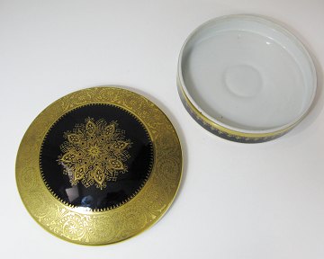 Limoges, lågskål med dobbeltforgyldte dekorationer i form af akanturblade og blomster samt medaillon ornamnetik på agatblå bund. Diam. 20 cm., H. 6 cm. Manufaktur J. Lavit, Limoges - France.