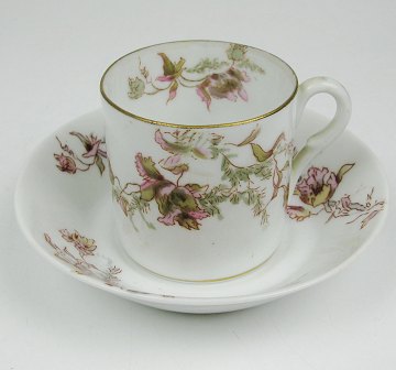 Kop og underkop af porcelæn, sirligt dekoreret med blmster, ranker og bladværk. Underkop Diam. 11 cm. Kuznetzov Manufaktur dess. 124, Skt. Petersborg - Rusland.