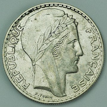 Frankrig, 20 francs 1937 SØLV - KM 879