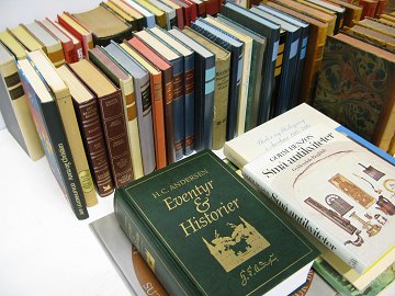 68 bind smukt indbundet skønlitteratur, heriblandt H.C. Andersen "Eventyrbogen", Danmarks fugle samt 2 stk. Bibler, begge med bladgulddekoration.