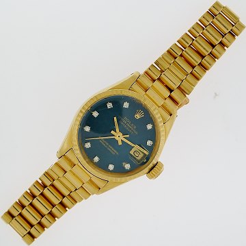 Damearmbåndsur fra Rolex, model Datejust, ref.nr.: 1625, i kasse og presidentlænke af 18 kt. guld, dybblå skive, prydet m. 10 brillantslebne diamanter, automatisk urværk. Ø. 25 mm.