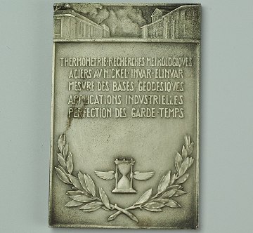 Stor medaille af sølv, udført i anledning af den schweiziske videnskabsmand, Charles Edouard Guillaume´s tilbagetrædelse fra the International Bureau of Weights and Measures i 1936. Guillaume modtog bl.a. Nobel Prisen i 1920.