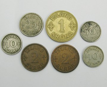 1 krona 1929, 25 aurar 1933, 2x 2 aurar 1938 og 1940 samt 3x 10 aurar 1925, 1929 og 1933