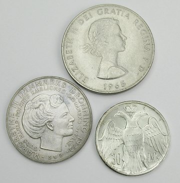 Lot bestående af Danmark, 10 kr Tronskifte 1972 sølv - H.1, Grækenland 30 drachmai 1964 sølv - KM 87 samt England crown 1965 Elizabeth II. - KM 910. Samlet finsølvindhold: 26,5 gr.