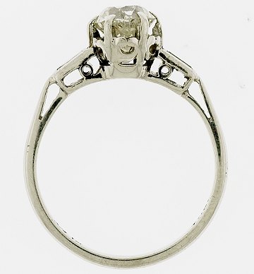 Ældre ring af platin, prydet m. en diamant på ca. 1.20 ct, flankeret af to baguetteslebne diamanter. Str. 56 1/2.