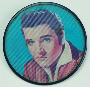 Originalt Elvis-badge i bemalet metal m. holografisk effekt. Ø. 63 mm.
