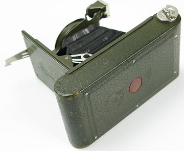 Lille kompakt "Boy scout" spejderkamera med olivengrøn kamerahus og tilhørende beredskabstaske, begge dekoreret med "fransk lilje" spejdersymbolet samt "Be prepared". 6,5 x 12 x 2,5 cm. Filmtype Kodak Nr. 127.