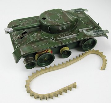 Philipp Niedermeier legetøjstanks af litograferet blik model PN-400. Urværksmotor og gnistfunktion ved front MG. Larvefødder af gummi. L. 18 cm.