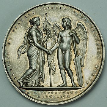 Veludført medaille af sølv, præget i anledning af Grundlovens vedtagelse d. 5. juni 1849, på fs. portræt af Frederik VII. Ø. 50,9 mm.