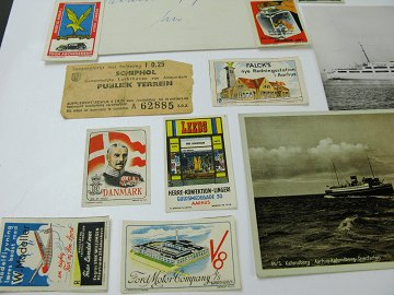 Frimærkesamling bestående af et større antal forsorterede danske mærker i poser, julemærker, samlemærker samt 2 postkort med henholdsvis Aarhus - Kalundborg færgen "M/S Kalundborg" samt Esbjerg - Harwich færgen "Kronprins frederik".