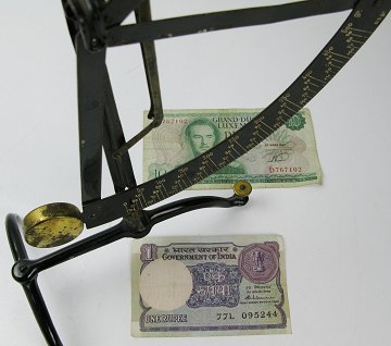Gl. postvægt 5:5 gram, max 500 gr. samt indisk rupee og 10 francs Luxembourg 1967.