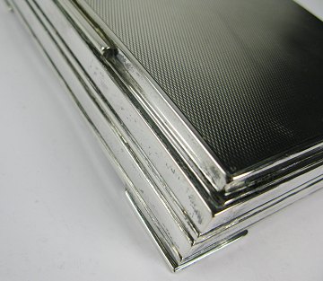 Cigarkasse af sølv, stemplet H.J. og 1955. 14 x 9,5 x 3 cm. Indvendig beklædt med cigarkassetræ, bund betrukket med fløjl.