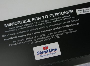Gavekort til to personers mini cruise med Stena Line fra Frederikshavn til Oslo, Værdi i alt kr. 690.- Mulighed for tilkøb af ekstra faciliteter. Gavekortets udløb er den 15.11.2012