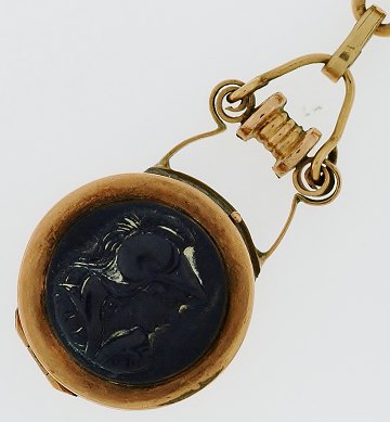 Chatelaine af forgyldt messing m. vedhæng m. gemme, prydet m. udskåret sort onyx i form af kvindebuste i rustning. L. 13 cm.