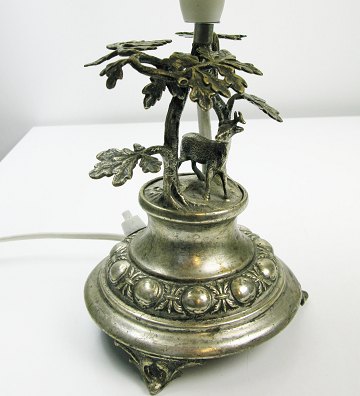 Bordlampe med lampefod af sølvplet i form af kronhjort i egeskov. H. med plisséskærm 32 cm.
