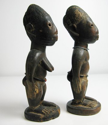 Yoruba Ibeji Twins, to sammenhørende figurer, skåret i træ og prydet med perle ankel- bælte- og halskæde. H. ca 21 og 22 cm. 19. årh. slutning.