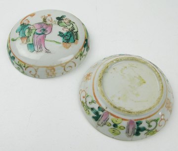 Kinesisk bonbonniere af porcelæn, låg dekoreret med håndmalede figurer i samtale. Korpus rundom dekoreret med blomsterornamnetik. Diam. 9 cm.