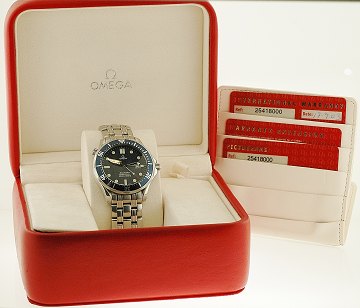 Herrearmbåndsur fra Omega, model Seamaster Professionel 300 M, ref.nr.: 25418000, m. kasse og lænke af stål, blå urskive med bølgestreger og fluoriserende punktinddeling, sekundviser, datoangivelse ved 3" position, marineblå lynette m. arabertal, safirglas, quartz urværk, vandtæt til 300 m. Ø 41 mm.
