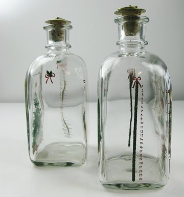 To Holmegaard juleflasker, formgivet af Michael Bang og dekoreret med julemotiver af Jette Frölich. H. 20 cm. Begge med original prop.