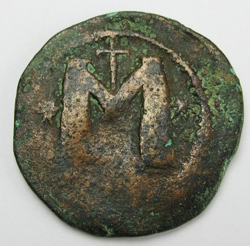 Byzantiansk bronzemønt, Justin I (518-527) Constantinopel mønt, portrætside utydelig med Justin I i rustning og rester af D N IVSTINVS P P AVG. Bagside med stort M med kors, flankeret af stjerner. Diam ca. 32 mm.