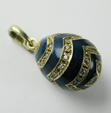 Æggeformet vedhæng af forgyldt sterling sølv, dekoreret med kongeblå emaille samt talrige brillantslebne sten. L. 28 mm., samlet vægt ca. 5,5 gr.