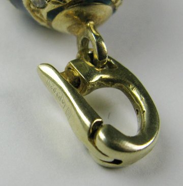 Æggeformet vedhæng af forgyldt sterling sølv, dekoreret med rubinrød emaille samt talrige brillantslebne sten. L. 28 mm., samlet vægt ca. 5,5 gr.