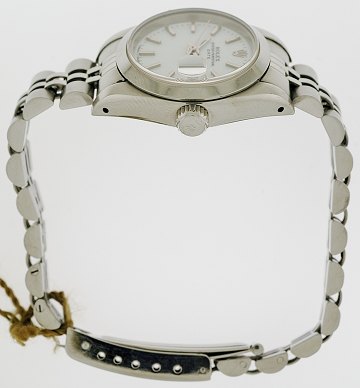 Damearmbåndsur fra Rolex, model Oyster Perpetul Date, ref.nr.: 69160, i kasse og m. jubileelænke af stål, hvid skive m. stregindeks, datoangivelse ved 3" position, safirglas, automatisk urværk. Fra 1989. Ø. 25 mm.