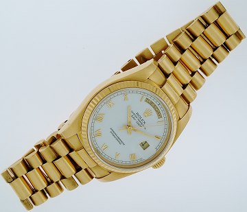 Herrearmbåndsur fra Rolex, model Day-Date, ref.nr.: 18038, i kasse og m. presidentlænke af 18 kt. guld, hvid skive m. romertal, dag- og datofunktion, safirglas, automatisk urværk. Fra 1984. Ø. 36 mm.