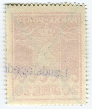 Pakke porto 20 øre med overstregning af blåkridtsblyant og afstemplet med "Landsfogeden".