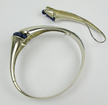 Smykkesæt af sterling sølv, bestående af armlænke og broche, begge prydet med lapis lazuli perler. Armlænke med sikkerhedslukke indvendig Diam. 6 x 5 cm. Broche L. 6,5 cm. Samlet vægt 54,6 gr. No. one design Aarhus, efter 1985.