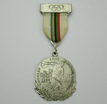 Erindringsmedaille fra de 23. olympiske lege i Los Angeles i 1984 "Los Angeles Olympiad Liberty". Motiv: Atlet med L.A. i baggrunden, forneden laurbær. Bånd i de olympiske farver. Fremstillet hos Reu GmbH & Co, Heubach. Medaille 45 x 50 mm.