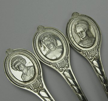 6 théskeer af sterling sølv, dekoreret med dronningeportrætter af Mary I, Mary II, Anne, Elizabeth I, Elizabeth II og Victoria. Alle Stemplet F.M. med London Hallmarks og 925. Samlet vægt 131 gr. 20. årh.