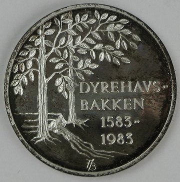 Jubilæumsmedaille Dyrehavsbakken 400 år 1583 - 1983 af sølv, Diam. 33 mm. Finsølvindhold 13,5 gr. Salgsetui og certifikat medfølger.