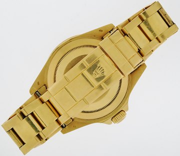 Herrearmbåndsur fra Rolex, model Submariner, ref.nr.: 16618, i kasse og m. oysterlænke af 18 kt. guld, uoriginal perlemorsskive m. punktindeks, prydet m. brillanter og facetterede safirer, safirglas, blå justerbar lynette m. arabertal, automatisk urværk. Ø. 40 mm.
