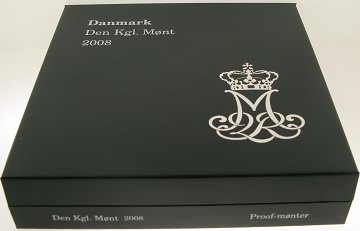 Original box containing 25 and 50 øre and 1, 2, 5, 10 and 20 kr from 2008. It also contains The Royal Danish Mint´s sterling silver medal.