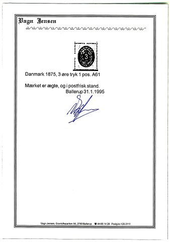 Danmark 1875, 3 øre tryk 1. pos. - *Katalogværdi 36.000,-*