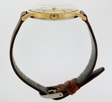 Herrearmbåndsur fra GUB Glashütte, kal. 70.3, i kasse af 20 mikron-forgyldt stål, champagnefarvet skive m. stregindeks, arabertal ved 12" og 6" position, originalt stål-bagkasse, monteret m. brun læderrem, plexiglas, manuelt optræk. Ø. 36 mm.