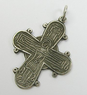 Vedhæng af sølv i form af krucifiks, på bagsiden helgenbilleder. 30 x 23 mm., vægt 2,4 gr.