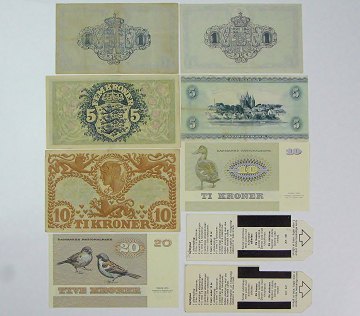 Lot sedler og togkort, bestående af: 1 kr 1916,-21, 5 kr 1943,-59, 10 kr 1943,-77, 20 kr 1979 samt to udløbne DSB togkort.